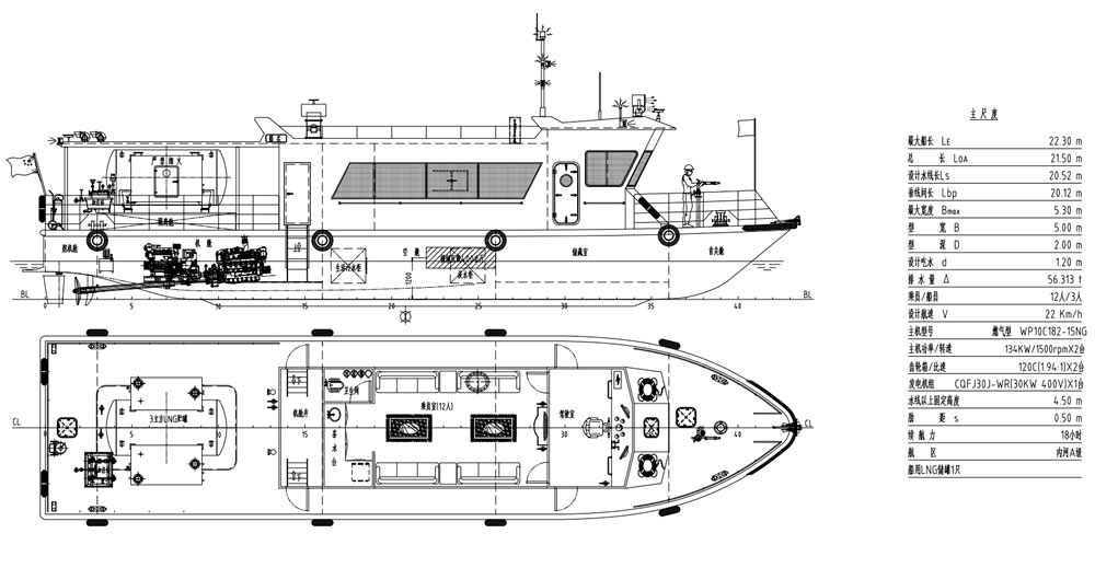 該船舶最大船長22.30 m,設計水線長20.40m,最大寬度5.30 m,型深2.00m,設計吃水1.10m,排水量48.21t,船員定額3人,乘員定額12人,設計航速22公里/小時,zzLNG船用燃料罐1個,燃氣續(xù)航力約18小時。