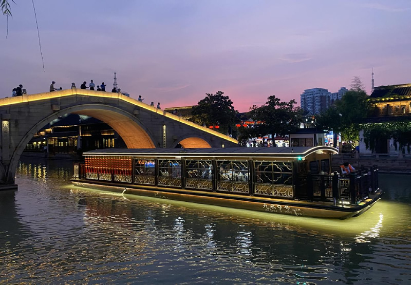 該船外觀及內(nèi)飾緊緊圍繞“紅船魂? 江南韻 ? 運(yùn)河情?國際范”的主題展開,整體采用仿古木藝的中式裝修風(fēng)格,充分彰顯嘉興江南水鄉(xiāng)、的文化魅力。